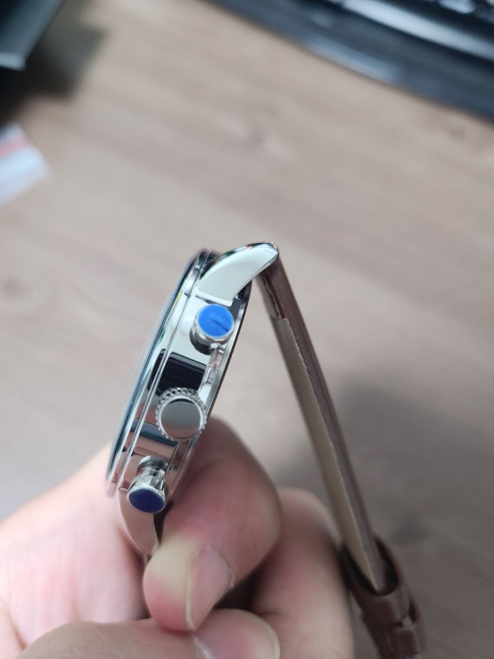 시계의 옆면에는 시계의 기능인 요일과 날짜를 조절할 수 있는 기능이었다 , 위는 요일을 , 아래는 날짜를 조절하는 버튼이었으며 손가락과 접촉하는 부분이 파란색으로 되어 뭔가 계속 누르고 싶다는 충동을 느끼기도했다.