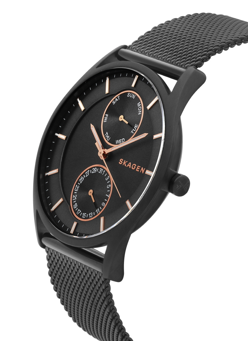 이 시계를 봤을 때 눈에 들어왔던 것은 첫번째로 블랙 메쉬밴드 , 전체적인 컬러를 블랙으로 사용하며 가벼운 메쉬밴드를 사용해 눈길을 끌었다.